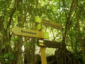 Desde Cerler, una vez finalizada la “circular”, procedemos a descender hasta la localidad de Benasque, por un antiguo y estrecho camino, actual PR HU-27, muy bien delimitado por unas paredes de grandes piedras de granito y de calzada empedrada, que nos ha llevado a la zona de pastos por entremedio de un espeso bosque, llamado de “Es Felegas”, con gran variedad de especies vegetales que llegan a formar unas tupidas zonas sombrías y en las que se prodigan los juegos de luces y sombras. Las vistas que nos ofrece este sendero sobre Benasque y el valle, son algo distintas a las que estamos acostumbrados.