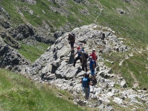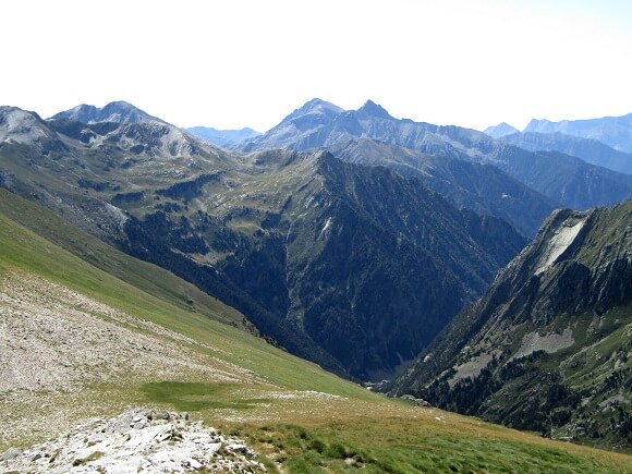 Subir al pico de l’Aiguillette y recorrer la Cresta del Puerto Viejo hasta el Puerto de La Forqueta, fue todo un acierto. Las vistas sobre las cercanas puntas y puertos que circundan el Valle de La Pinarra y de los macizos y valles en la vertiente francesa son extraordinarias. Abundan los esquistos de pizarras oscuras, que datan del Silúrico (hace unos 400 mills/años), y nuestro caminar por la cresta hasta el cercano Puerto de la Forqueta, lo tenemos que hacer por estrechos ‘senderos de vacas’ –llamados así porque se forman cuando el suelo se empapa de agua y sufre ciclos de hielo—.