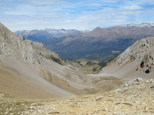 Vamos subiendo y las vistas sobre el fondo del Valle de Bardají son cada vez mejores, con las desnudas y pronunciadas laderas que bajan del Baciero, contrapunto del manto verde que desciende desde el Turbón, de profundo y áspero arbolado. Se va abriendo la ventana del fondo del valle y aparecen las estribaciones de Sierra Ferrera; se percibe con claridad la flexión que hace el macizo de Baciero; el murallón que conforma la Sierra de Chía, un poco torcido como un arco, con sus áridas cantaleras asomándose sobre el río Ésera; y, al fondo, el impresionante macizo pirenaico, con los Picos Gallinero (2728 m) y Basibé (2725 m) en primer lugar y sus ramales desprendidos que vienen a enlazar con el Turbón, dejando un amplio espacio abierto intermedio, para desde aquí ir a empalmar con Cotiella a la vez que estrechan el cauce del Ésera, con los colosos macizos del Pirineo cubriéndole las espaldas (Maladeta y el pico Aneto con sus 3404 m, así como el de Perdiguero y su homónimo pico de 3221 m, y el de Posets con su pico también de igual nombre y sus 3369 m). ¡Un espectáculo para la vista!, casi duelen los ojos al admirar tanta belleza paisajística.