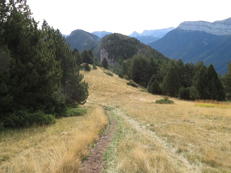 Una vez en Lo Grau, punto de observación de las dos vertientes de la sierra: al norte Sierra de Liena y el Valle de Chisagües; al sur Sierra d’as Zucas y Valle de Pineta, tomamos a nuestra izquierda una marcada senda que nos llevará primero a la Plana d’el Dué —junto al Tozal Blanco (1994 m)— y después continuará por una amarronada y extensa tasca alpina hasta lo alto del Pico Comodoto.