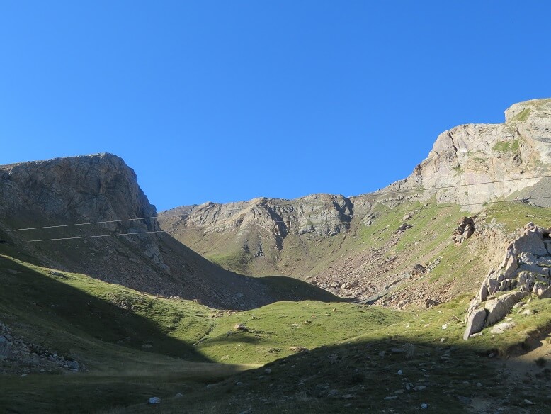 Llegar a lo alto del collado nos permite descubrir nuevos horizontes: el Valle de Castanesa se abre ante nosotros (ver post de entrada en el blog). Unas colosales piedras y depósitos de derrubios adornan las laderas de las montañas, las cuales fueron arrancadas por impetuosas tempestades a lo largo de los tiempos, pues las cercanas cumbres, en la época invernal, se hallan cubiertas de nieve. Alegres y vistosas praderas tapizan el fondo del cercano Valle de Castanesa.