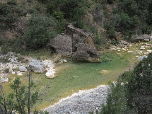 Seguimos cruzando barrancos —los de los Santos y de la Creu— en nuestros descenso hasta el mismo cauce del río Balcez – Isuala (según la toponomía, ‘Isuala’ quiere decir: terreno aislado por montañas), antes de llegar al ‘Tranco de las Olas’, un lugar de encuentro de las rocas y las aguas —Tranco, designa al lugar por donde se puede cruzar un angosto paso de un salto—.